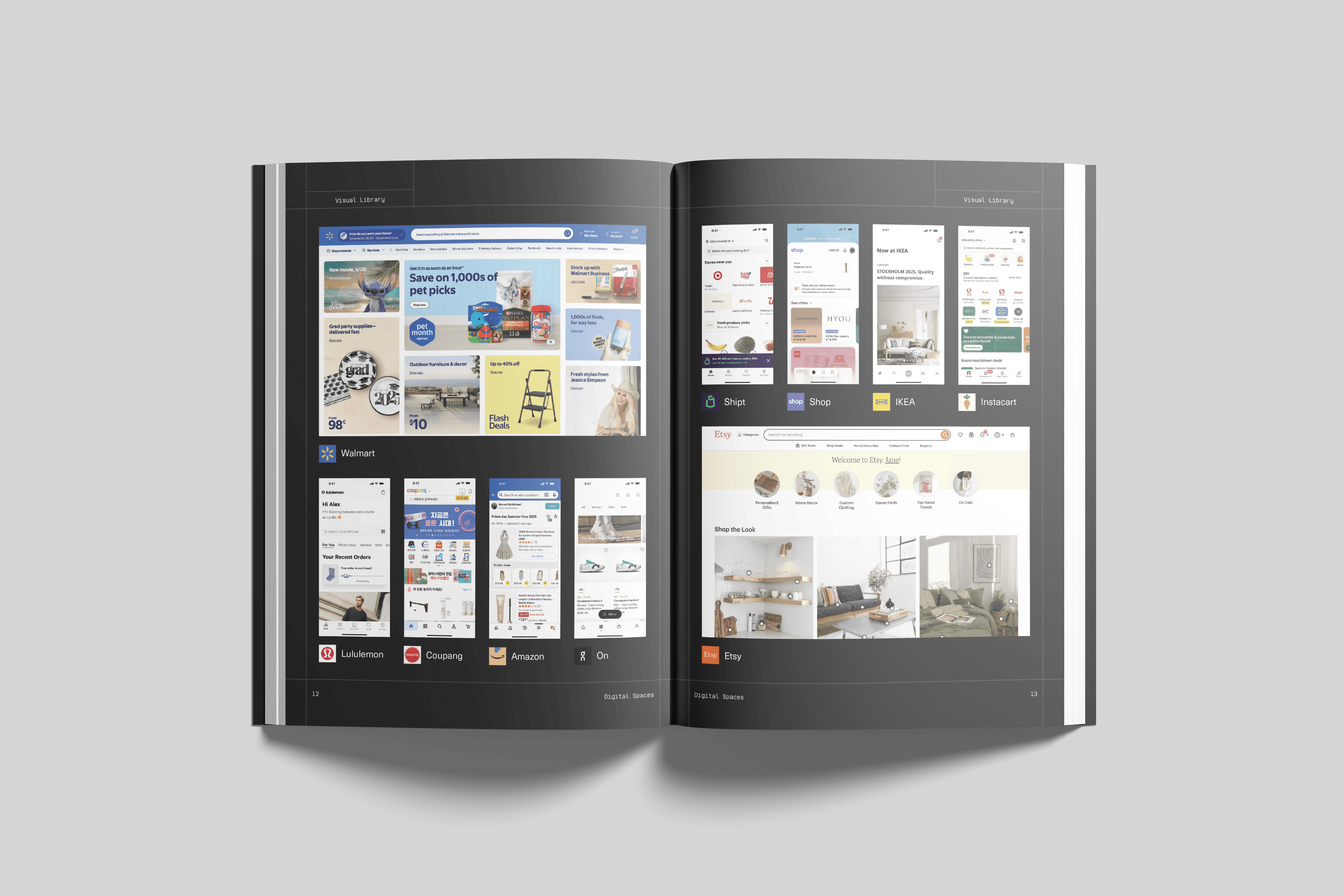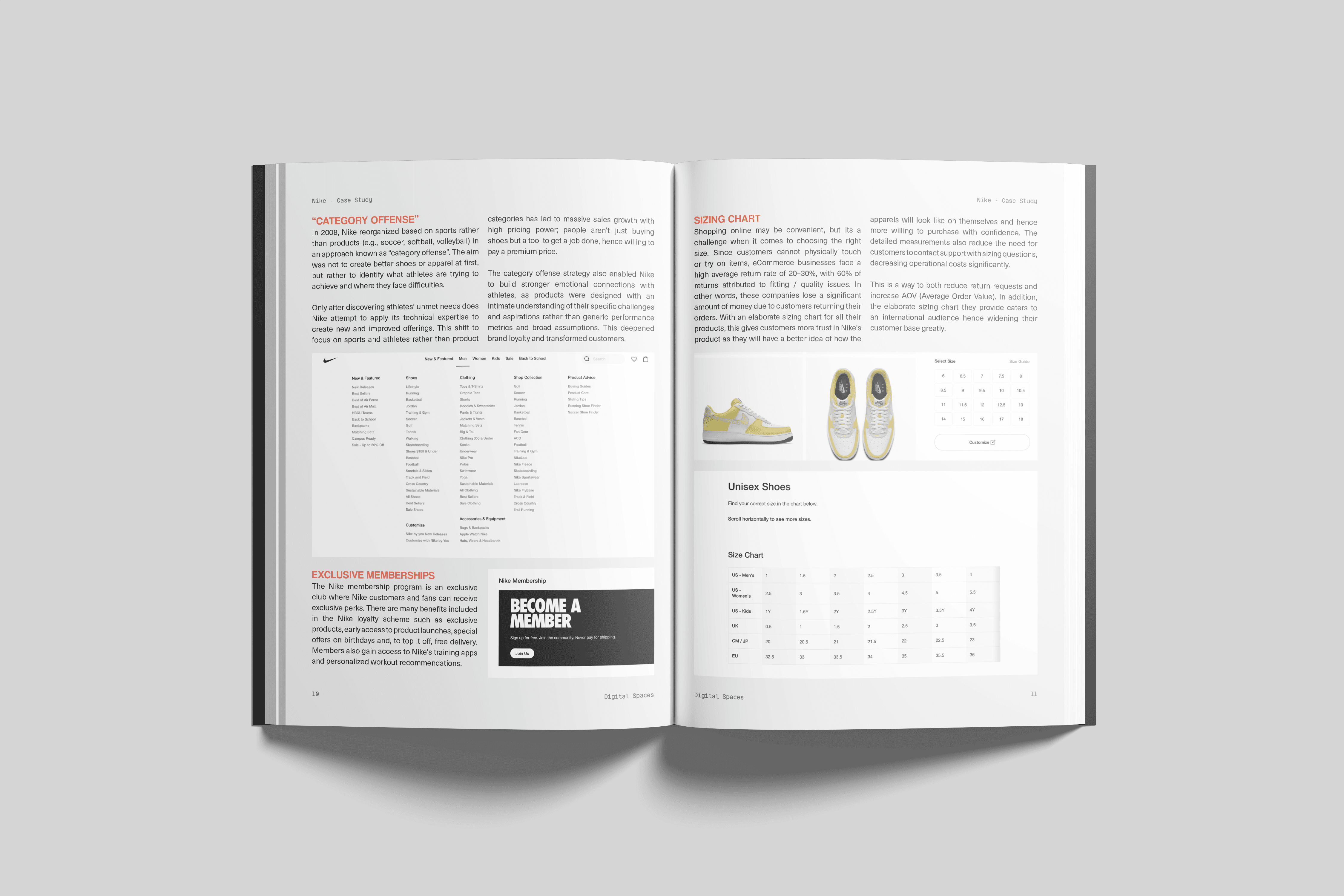 Designed a complete 30+ page publication featuring a pixelated retro-computer cover that bridges digital and analog design eras. Implemented a strict modular grid system throughout interior spreads, organizing complex case studies—including e-commerce apps, Nike's pricing strategies, and sizing chart implementations—into clean, scannable layouts. Used strategic typography with a pixelated display font for section headers and clear sans-serif body copy to maintain readability. Incorporated visual libraries and screenshots as documentation elements, treating digital interfaces as specimens worthy of academic study. Managed the full production workflow including color calibration, paper selection, and professional binding to ensure the final printed piece met publication-quality standards.