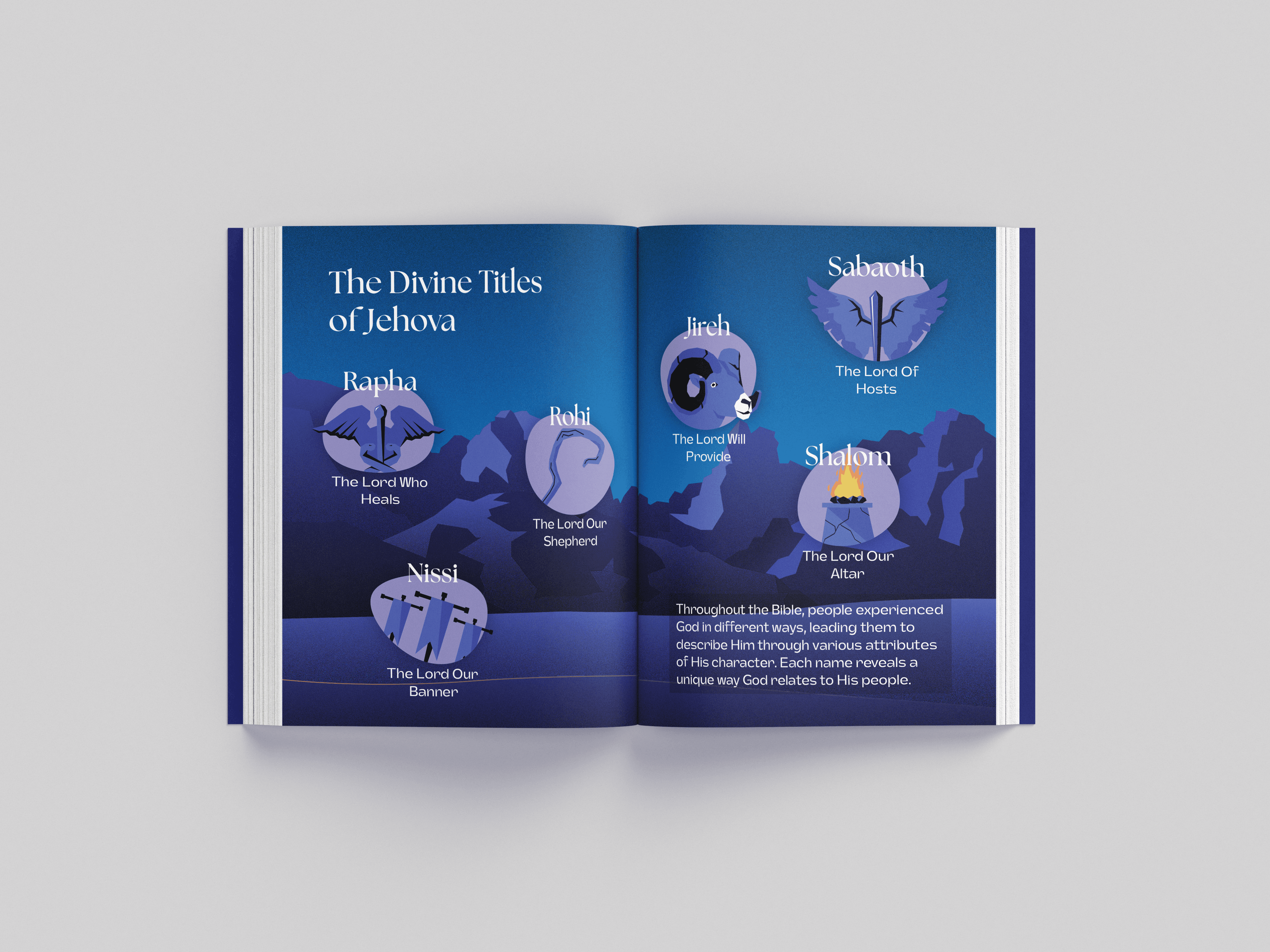 Developed "Jehovah: More Than A Name" as a journey through biblical narrative, anchoring the entire design around the iconic burning bush from Exodus 3:14—the moment God reveals "I AM WHO I AM." Used this powerful visual motif as both a storytelling device and unifying design element to guide readers through the exploration of divine titles and their personal significance.