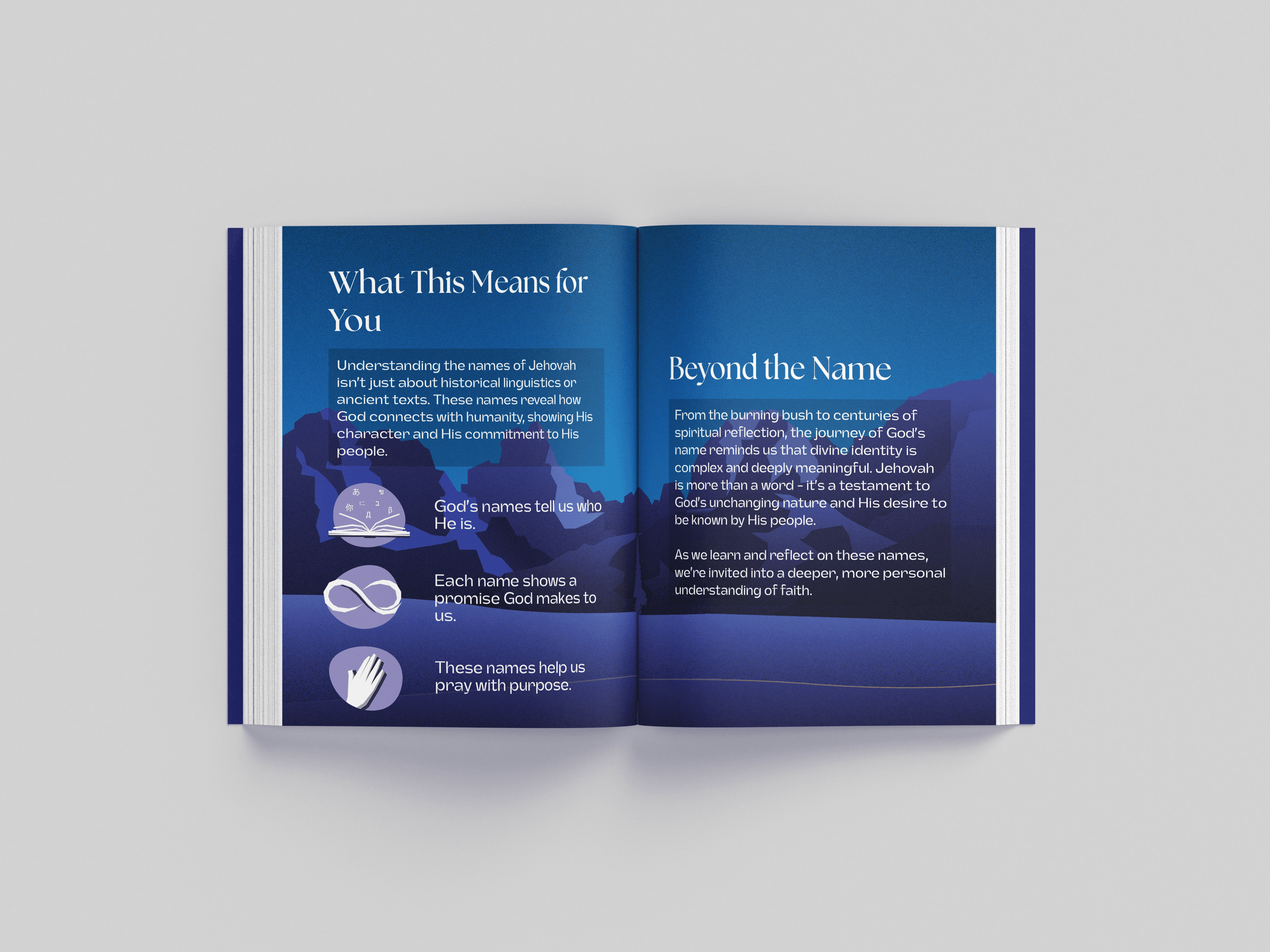 Designed a complete publication featuring a dramatic twilight color palette of deep blues, purples, and warm flame yellows that evoke both reverence and approachability. Created custom illustrated icons representing each divine title (Rapha, Jireh, Rohi, Nissi, Sabaoth, Shalom) with symbolic imagery—medical symbols for "The Lord Who Heals," shepherding for "The Lord Our Shepherd," and altar imagery for "The Lord Our Altar." Implemented elegant serif typography for headers paired with clean sans-serif body text to balance traditional religious gravitas with modern readability. Carried the burning bush illustration across multiple spreads as a narrative thread, creating visual continuity while exploring different facets of God's character. Concluded with "What This Means for You" and "Beyond the Name" sections that transform historical-linguistic study into personal reflection and actionable faith practice, successfully achieving the educational and inspirational goals of the project.